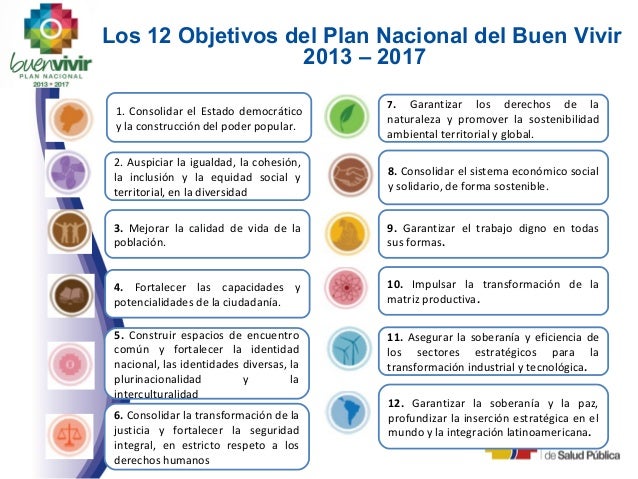 El Plan Nacional para el Buen Vivir 2013-2017 (impulsado por el gobierno de Rafael Correa) es un instrumento creado para articular las políticas públicas con la gestión y la inversión pública. El Plan cuenta con 12 Estrategias Nacionales; 12 Objetivos Nacionales, cuyo cumplimiento permitirá consolidar el cambio que los ciudadanos y ciudadanas ecuatorianos con el país que anhelamos para el Buen Vivir.